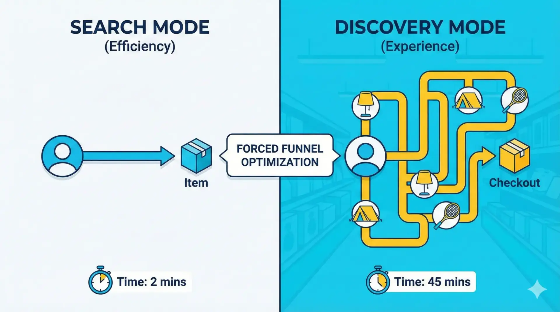 Decathlon doesn’t want you to find the water bottle efficiently. They want you to visualize yourself camping. IKEA doesn’t want you to buy a chair. They want you to visualize a cozy Sunday in that living room setup.